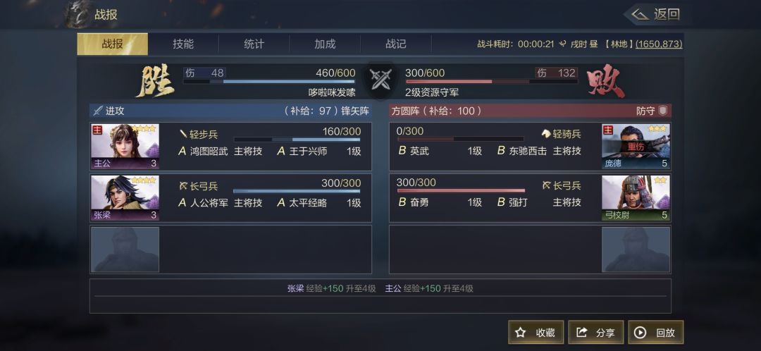 但只要是也有部分释放的武技效果就不会记录为携带加成,此战战报中敌方有庞德,而庞德的英武技能效果为攻击时赋予自身武力加成10秒,即使在技能界面可以看到这次战斗中已成功触发,也没有被携带武技加成记录。