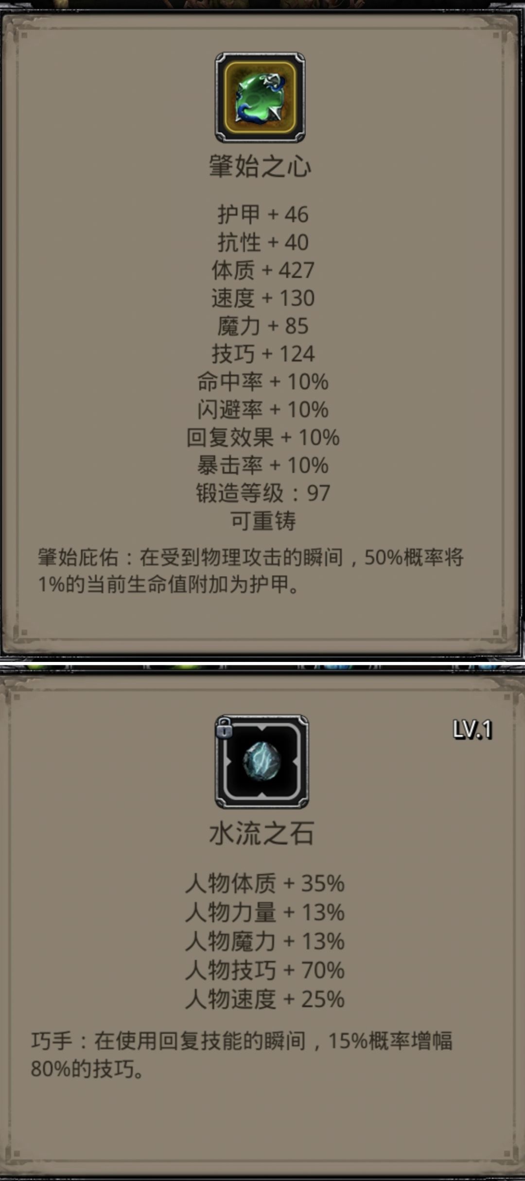 能给群奶提供物伤减免又能不牺牲很多奶量的装备就只有肇始之心可以用了,50%概率将1%生命值附加为护甲,再算上神官技巧魔石的15%概率增幅技巧,两件装备在连续三次群攻内触发1次就能避免传法暴毙。