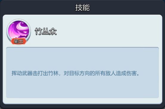 技能介绍:挥动武器击打出竹林,对目标方向的所有敌人造成伤害。