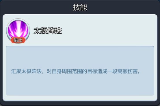 技能介绍:汇聚太极阵法,对自身周围范围的目标造成一段高额伤害。