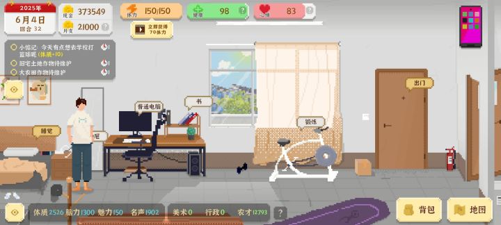 我走的是种地路线,第二回合把农才看书升到100,和小花搞好关系后农业自己会提升,体力基本用来种地和跑步了,谈恋爱基本没难度,很容易拿的一万,然后就是解锁两个小田后能解锁大田,我大田第一次收稻子就有12万,但租下来有一万二,所以要抓紧时间存够一万二,基本上明天在网购看广告能领低保,存下来不难,而且后面的5万任务是15回合,大田不放化肥是10回合熟,加上播种收割卖3回合,一共是13回合,放化肥只需要8回合,而且随着你卖粮食的次数增多,临时商贩东西会越来越便宜,粮食收购价会越来越高,基本上收一次大田后你就不会存在缺钱了,后面爱咋耍咋耍