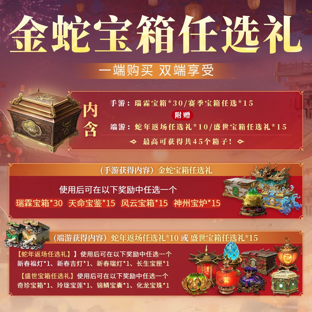没错!在手游购入一份【金蛇宝箱任选礼】,还能获得端游的15个盛世宝箱任选礼或10个蛇年返场任选礼哦!