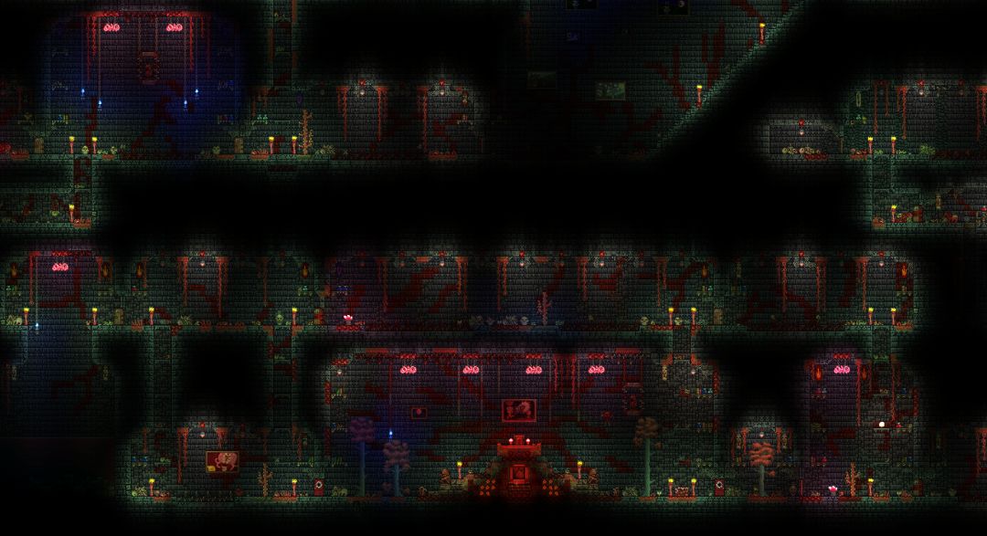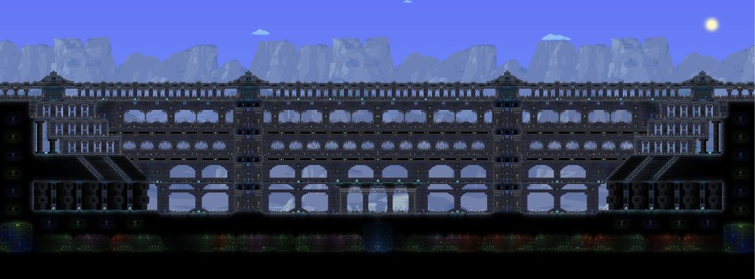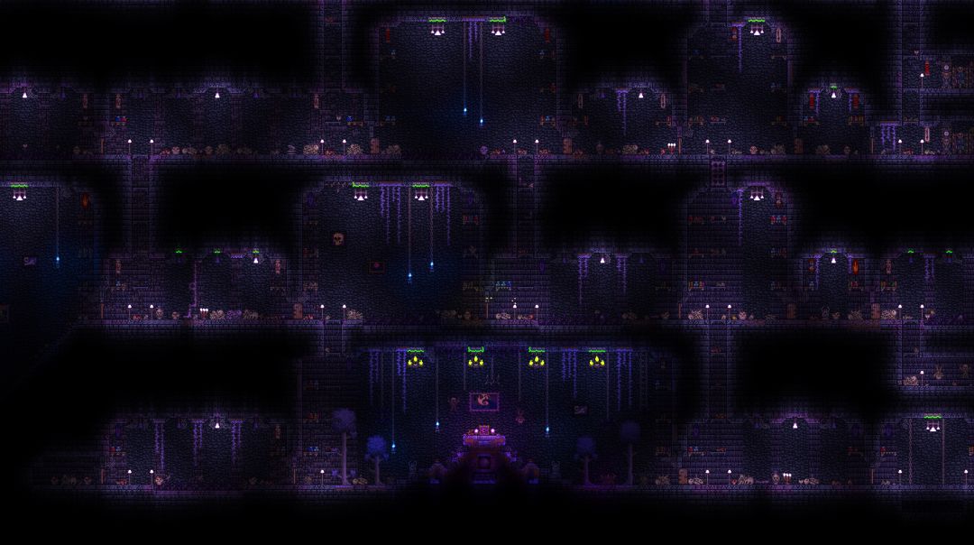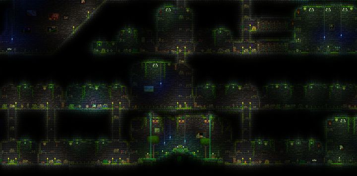 泰拉瑞亚诸神黄昏终章地图地牢,地牢整体(8400*250)外围均铺有大小风格不同的城池,共计44座城池,一些城池联通地牢内部,同时该地牢也是唯一前往地狱的出入口,地牢中间为终末的竞技场-瓦尔哈拉竞技场,竞技场规模庞大,内设有Boss战场地,玩家需要在竞技场内击败骷髅王方可进行地牢和地狱区域的探索,地牢内部则分为七大区域,极寒地域、沙漠地域、丛林地域、腐败地域、红莲地域、圣域以及原地牢区域,每种区域下也有联通地狱的通道,并且每种区域均设有不同种类的陷阱、敌怪和各时期宝箱奖励。