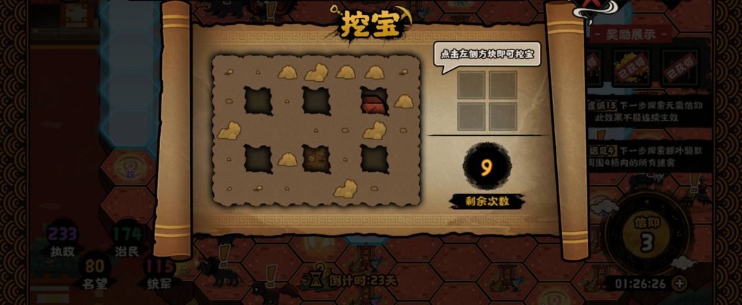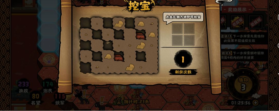 因此推荐开局先用六次机会,挖中间的六格,通过这种方法,排除大石头和纹石宝箱。