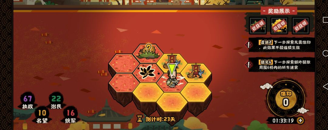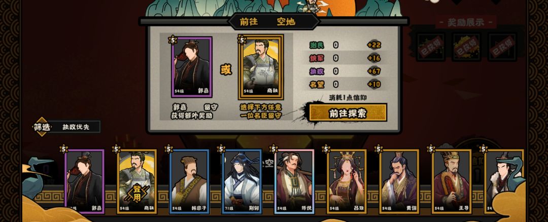 ①第一步推荐使用执政属性最高的名臣(比如我这边是商鞅),方便触发高级远见效果,尽可能多的看到周边的地图。