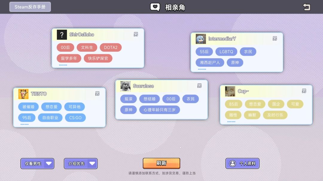 从早到晚的安排自己一天的行程,或刻意又或自然而然,就像是我真的成为了游戏中的角色,在与女主的一次又一次的邂逅,不禁让我产生了来一场甜甜恋爱的念头,有意思的是,制作组竟然真的在游戏中内置了一个社交软件,这令我大为震撼,正如同游戏中的单身男女配对一般,你也可以将自己的喜好以及择偶标准写在上面,等一个有缘人的出现,不过游戏毕竟还是偏男性向一些,所以女孩子确实少一些。