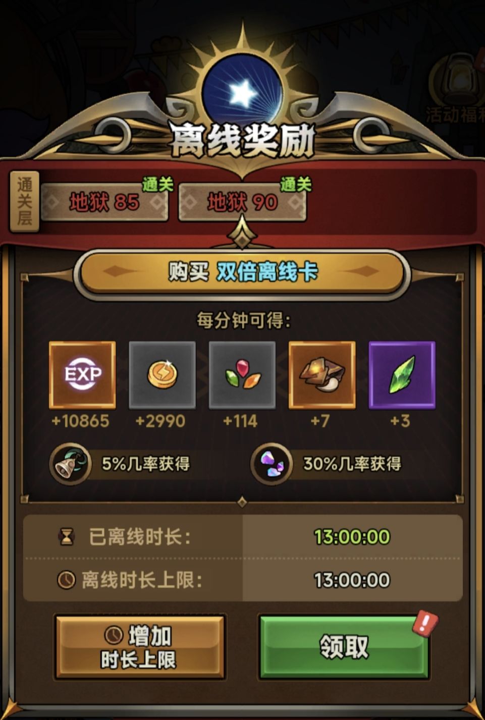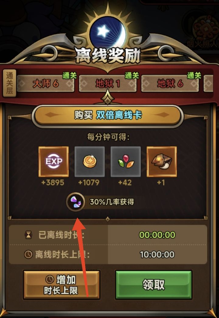 第一天、上线建号,随便玩到地狱1层就够了,解锁了离线30概率获取彩虹石,就可以挂机了。拉满广告材料和金币花完全买不朽魂铃。
