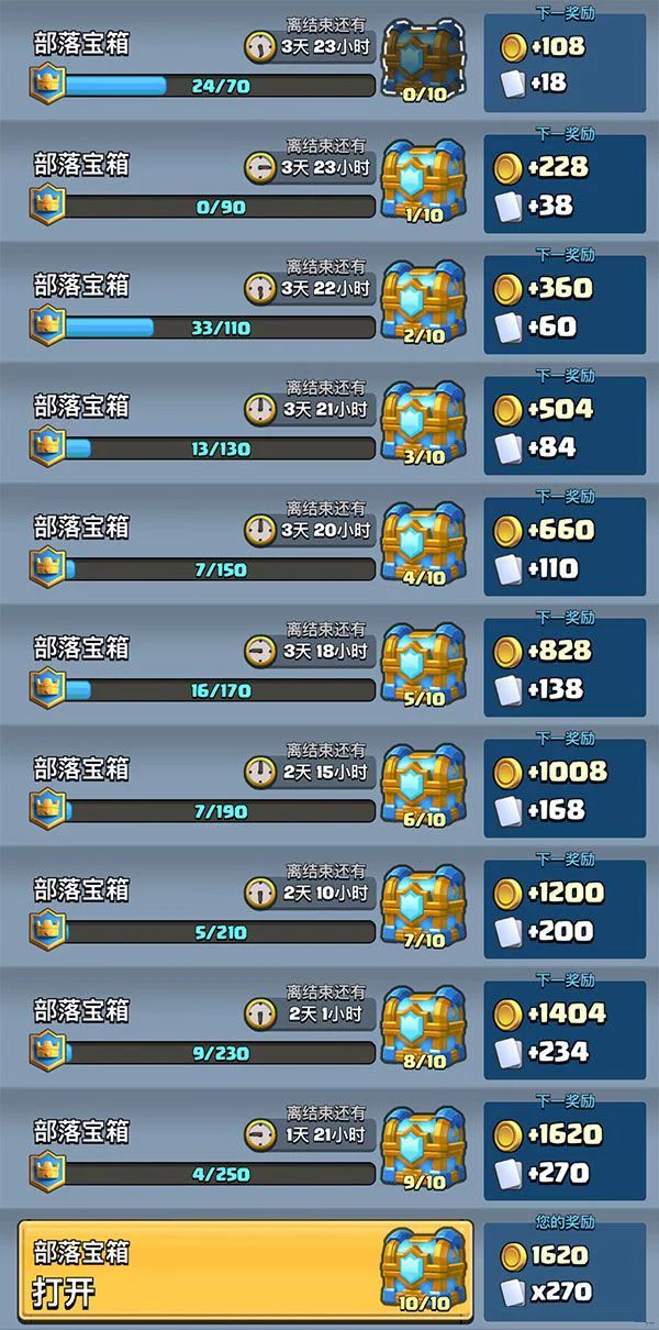 这段话说的真好,也是很多玩家的心声。这导致很多部落都无法在一周内把部落宝箱打满,撑死也就打个七八阶段,有些较死的部落甚至来个三四阶段就算好的了。看着满阶段的奖励,你却不能全带走,难受吗?
