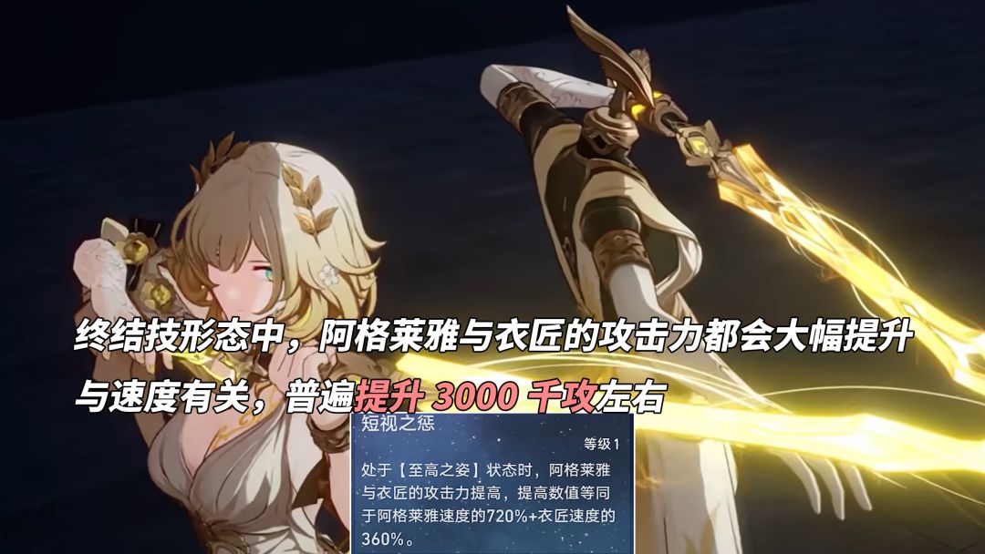 54%普攻增伤(上述层数叠满后触发)。此增伤,阿格莱雅强化普攻‘本体与忆灵连携攻击’可生效,单纯忆灵自身攻击不生效(忆灵技)。