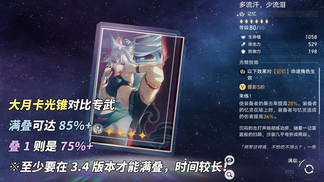 ①大月卡「多流汗,少流泪」期望85%+,在叠1/叠5时,12%/20%暴击+24%/36%增伤。