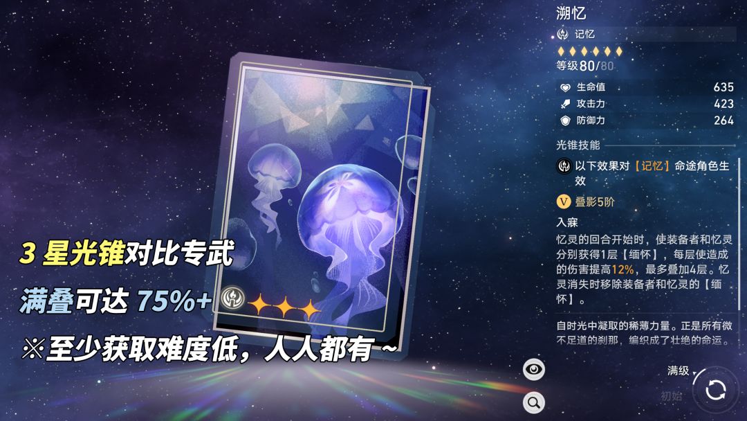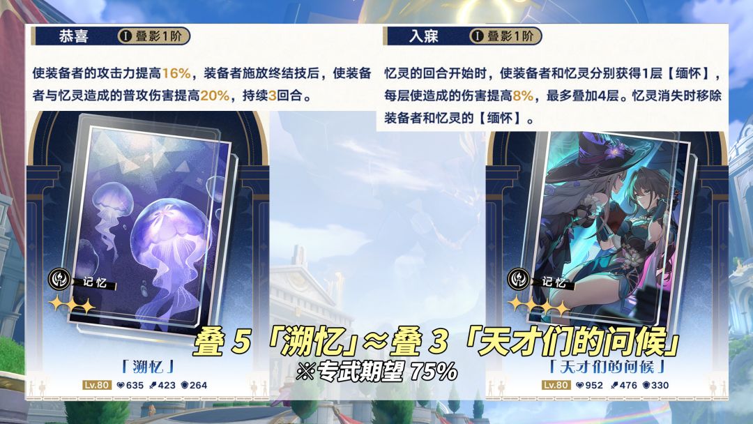 ②3星「溯忆」期望75%+,忆灵每次回合开始时获得1层缅怀(装备者与忆灵12%增伤),至多4层48%增伤。若忆灵消失则需要重新叠层,适合配队‘星期日+阿格莱雅’的玩家,确保实战无缝大招永续忆灵~
