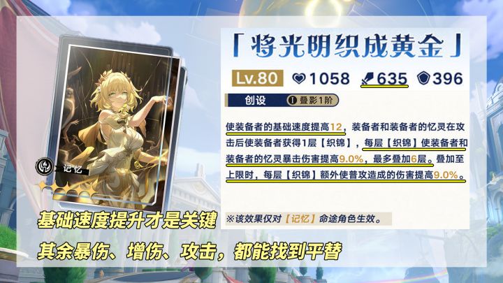 作为崩铁首个5星记忆光锥,「将光阴织成黄金」优势明显,并且泛用性极高,不完全局限于阿格莱雅使用: