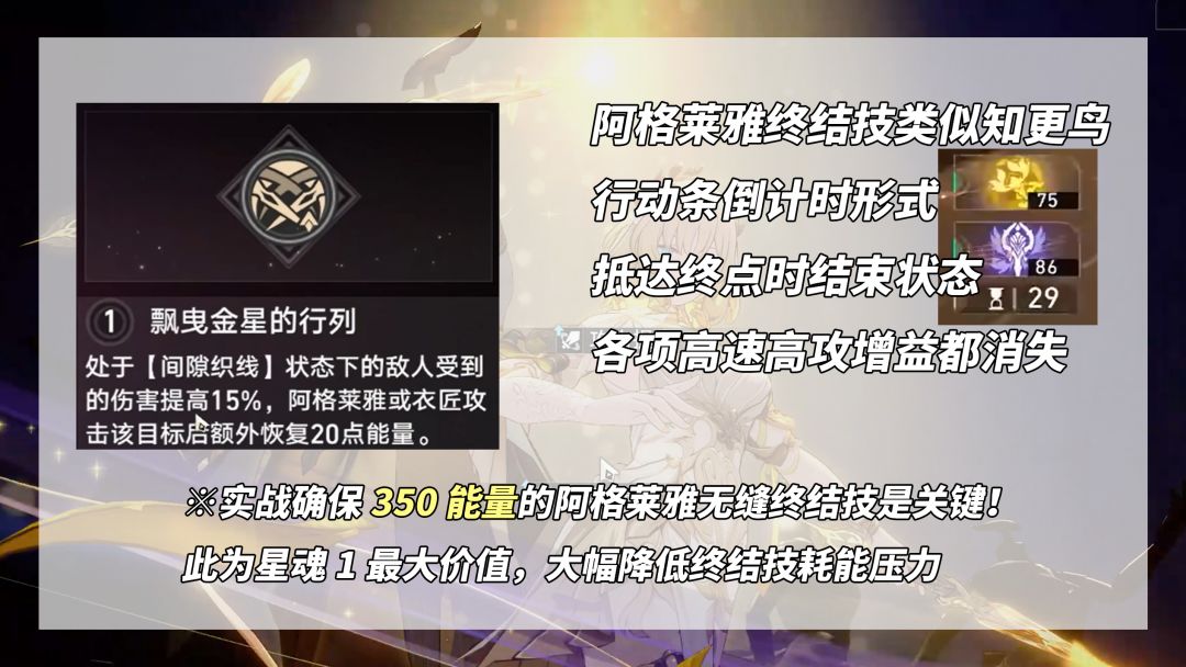 【01还是10?】阿格莱雅星魂1,天赋标记目标16%易伤,阿格莱雅或衣匠攻击是额外恢复20能量,对于无星期日的玩家来说挺重要,实战无缝衔接终结技的关键。有星期日先看光锥「将光阴织成黄金」,无星期日先考虑1魂。