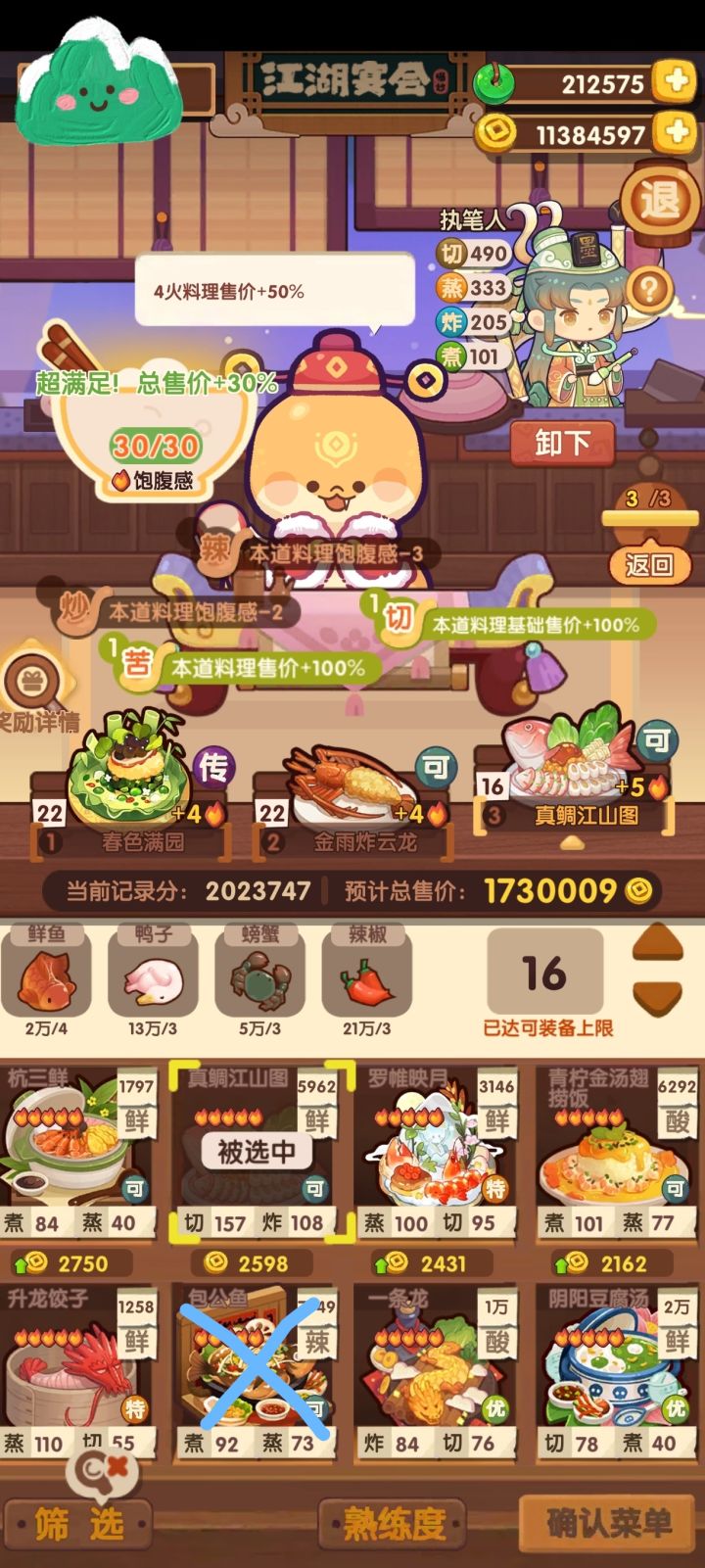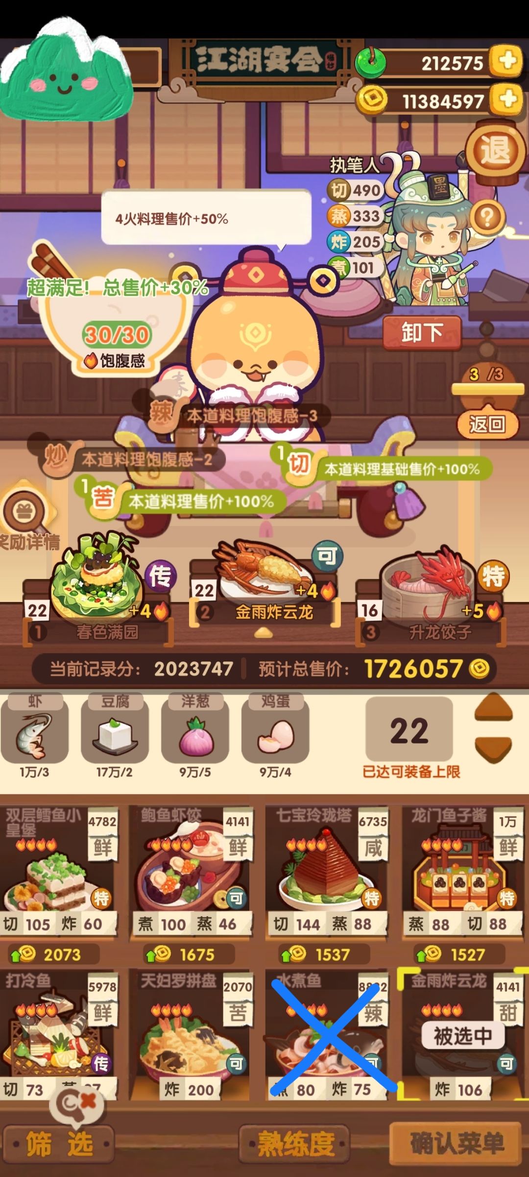 第一轮和第二轮没有测试过换别的菜,不够分需要自行调整;第三轮第一个菜基本固定的,后两道菜除了画叉的,截图中有的都能替换上去,分数浮动不大