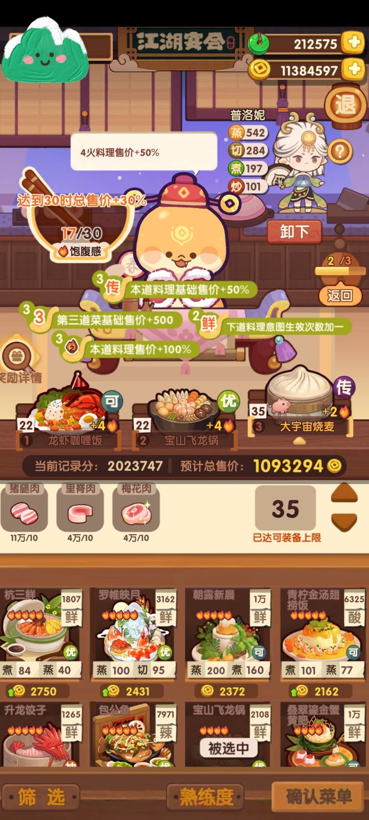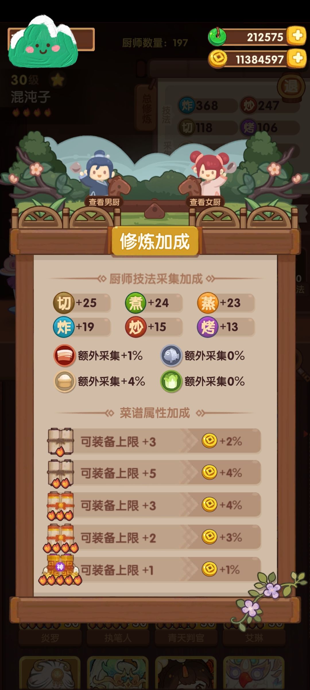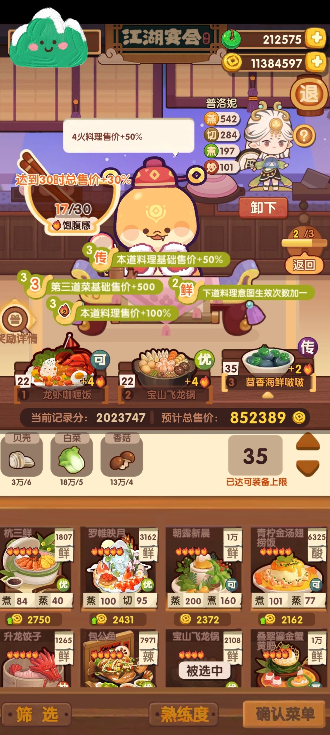 之前的那版小号乐乐妹带了60蒸厨具,大号以前为了宴会拉满厨具(但没有打石头),感觉部分伙伴抄不动作业,所以特意挑了贴近新版本厨子(都没有厨具)和菜谱,但这小号始终有点基修,大家得自己根据数值需求调整上场厨子