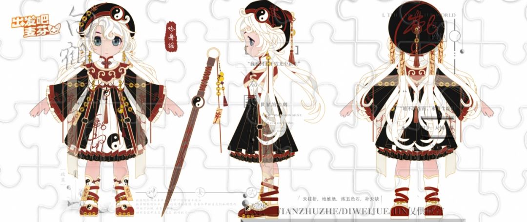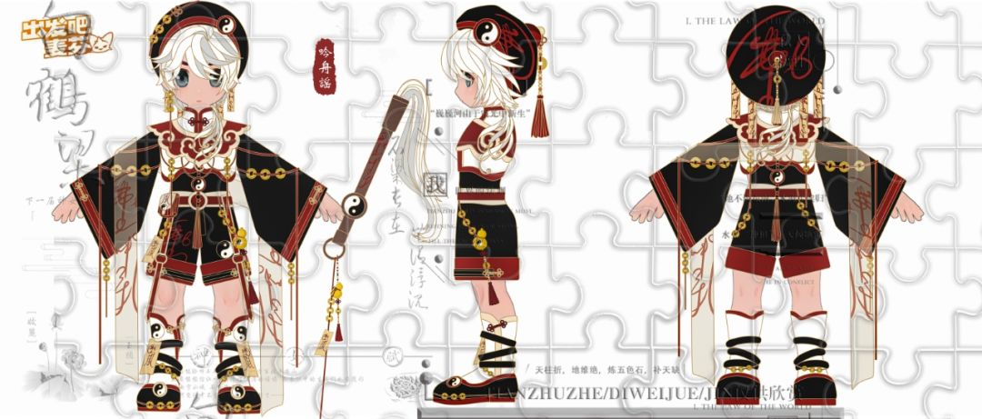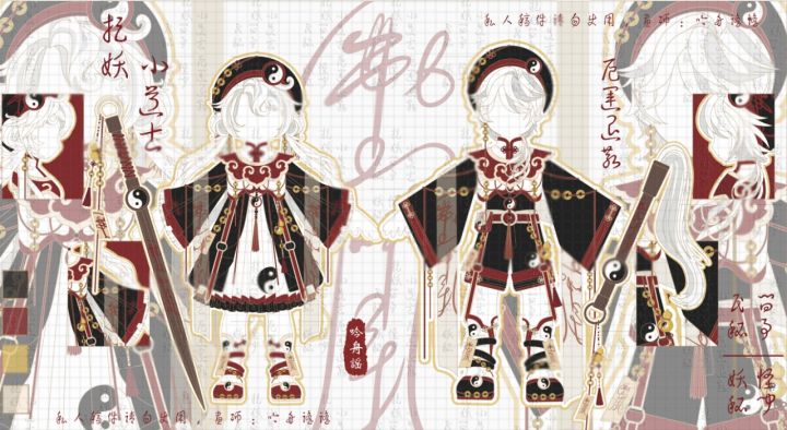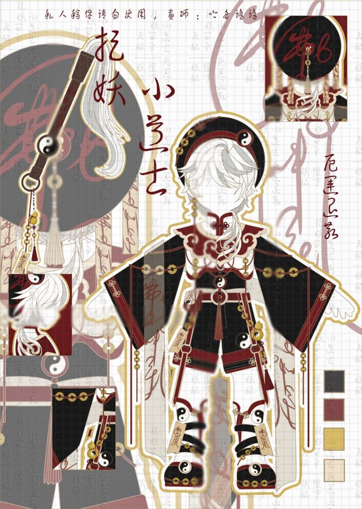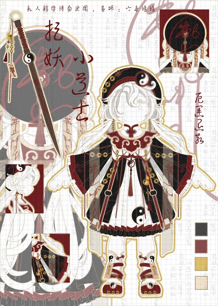 真的超爱国风元素!!!白发捉妖师!!运用了八卦、符箓、铜钱、葫芦等元素。武器画了传统的桃木剑和拂尘。整体服装运用了红色搭配,小道士的新年限定套装!祝大家新的一年红红火火,霉运消散!!!
