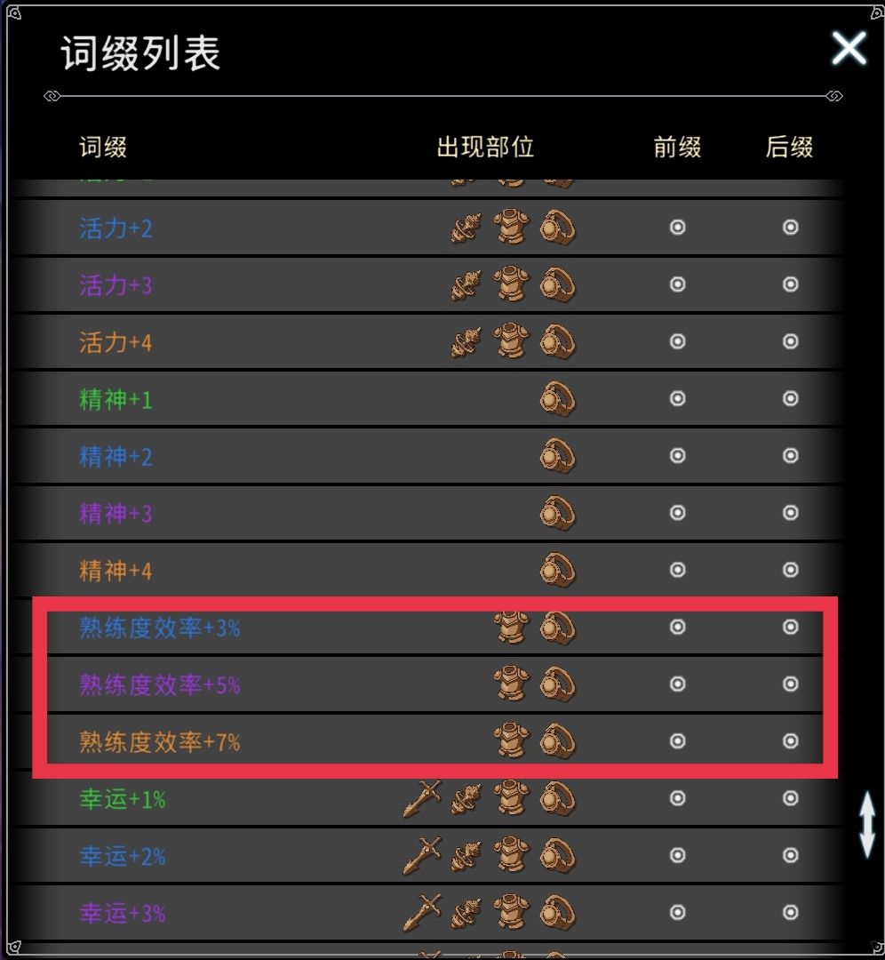 2.刷专精装备四个未满专精的装备效率最高,四件可以一起提升。获取的熟练度四个位置是共享。