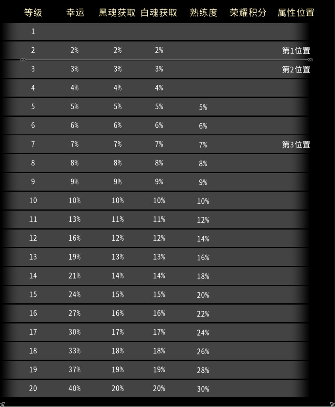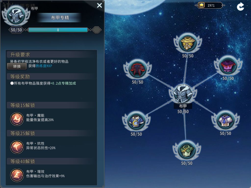 每种护甲和饰品的中心专精等级达到15,25,40。会解锁对应的的特殊效果。