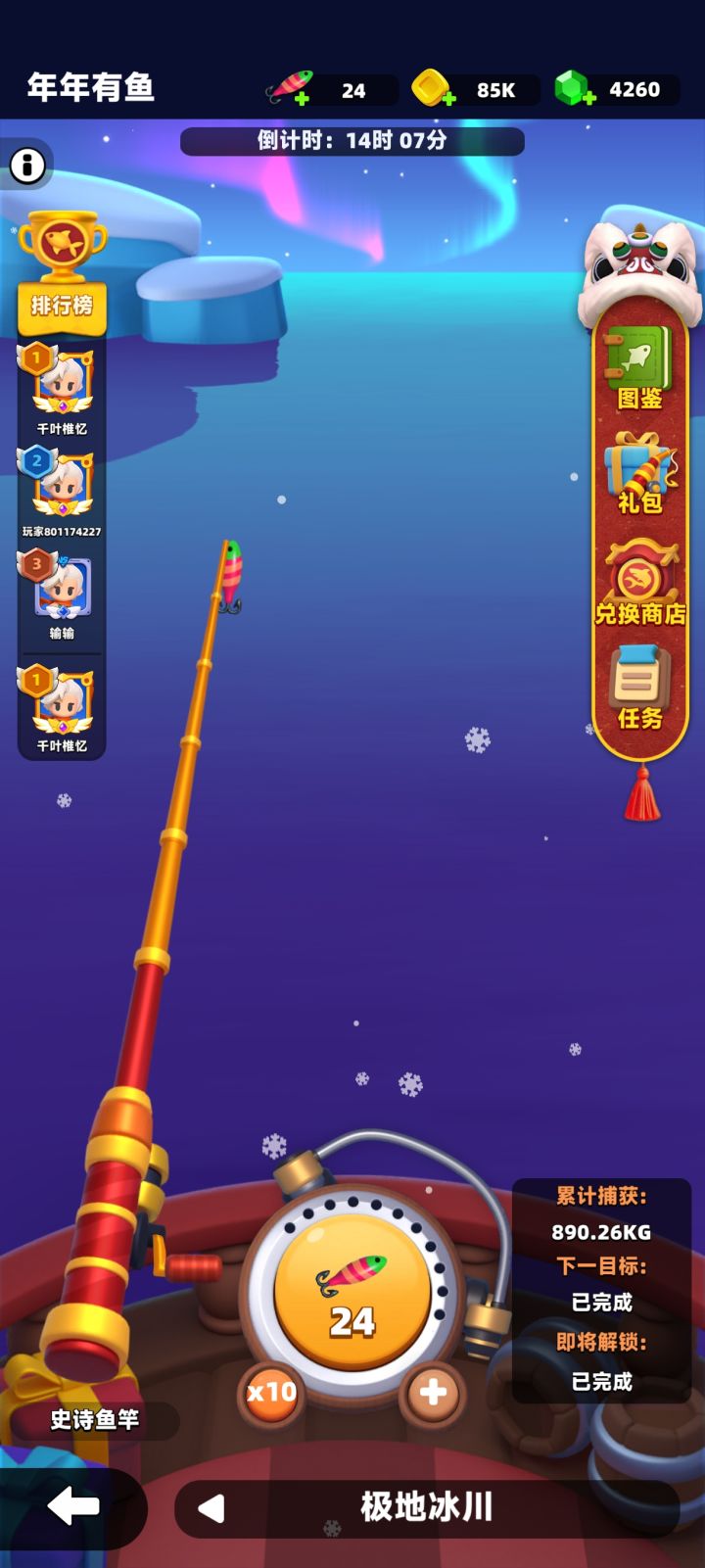 不过活动快到期了,发现的有点迟,一开始闲的没事就在那点点点,导致鱼线没断过。