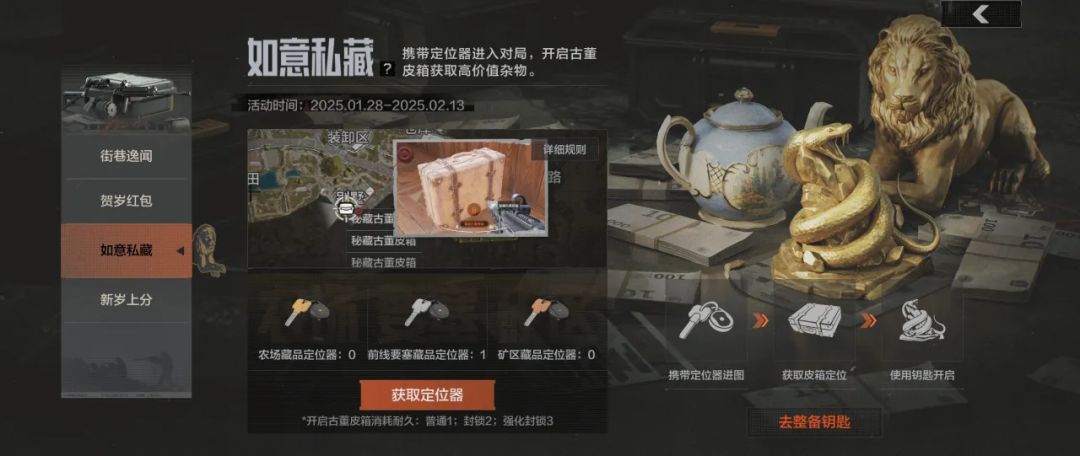 <玩法说明>秘藏古董皮箱四散在暗区各处!活动期间先锋可通过完成活跃任务或市场购买“藏品定位器”,前往指定地图开启秘藏古董皮箱,有概率获得高价值杂物,还有几率获得盘蛇金像!