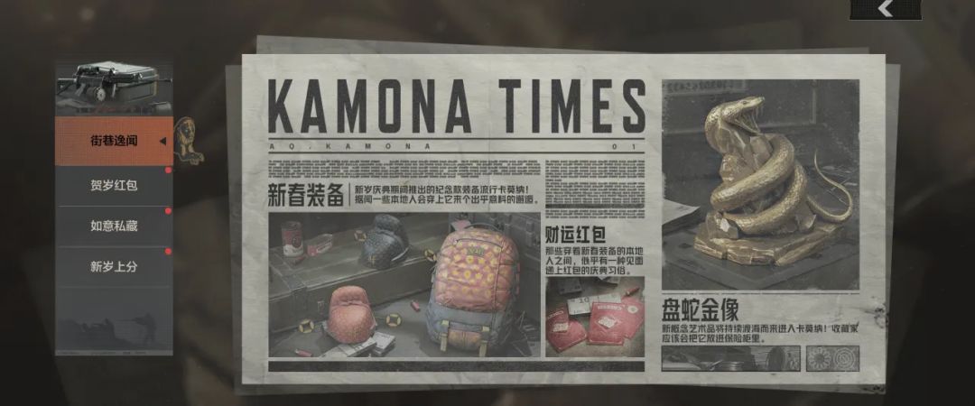 新岁庆典来袭!纪念款装备流行卡莫纳,与身着新春装备的本地人邂逅,还有机会收到财运红包?传说中的盘蛇金像进入卡莫纳,已被收藏家小心锁进保险箱?谜底等待揭晓,赶紧来暗区一探究竟!