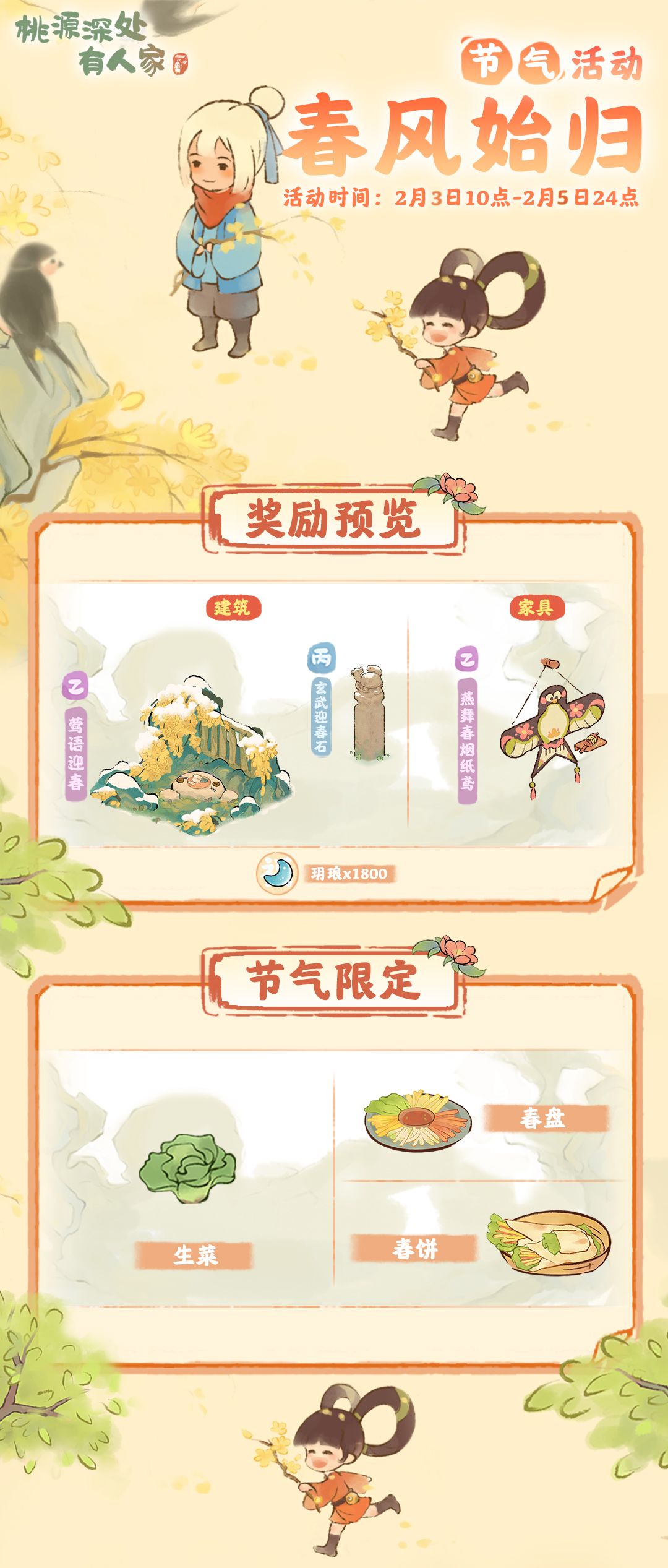 山民们在活动期间内,可种植「生菜」和制作特殊节气菜品「春盘」和「春饼」,看着节气美食小萝卜的口水都止不住了,尊嘟太香萝!萝萝山已准备好了本期的节气限定建筑和家具,山民记得参与活动获取玥琅,不要错过兑换时间萝~