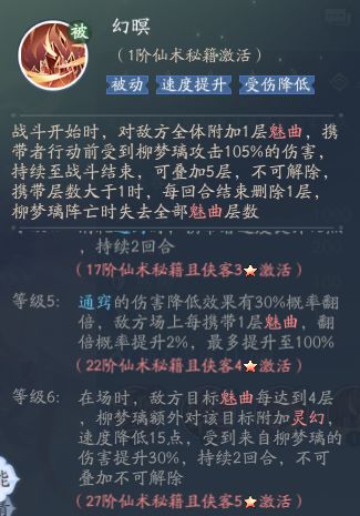 魅曲:敌方携带者行动前会受到柳梦璃攻击105%的伤害,可叠加5层,不可解除,每回合结束会减少1层,减少到1层时就不会减少,持续战斗结束,一个类似于诅咒的技能,只有一种解除方式就是柳梦璃死亡。