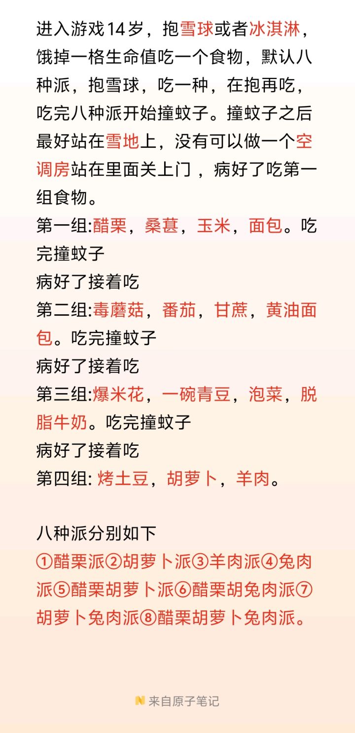 进入游戏14岁,抱雪球或者冰淇淋,饿掉一格生命值吃一个食物,默认八种派,抱雪球,吃一种,在抱再吃,吃完八种派开始撞蚊子。撞蚊子之后最好站在雪地上,没有可以做一个空调房站在里面关上门 ,病好了吃第一组食物。