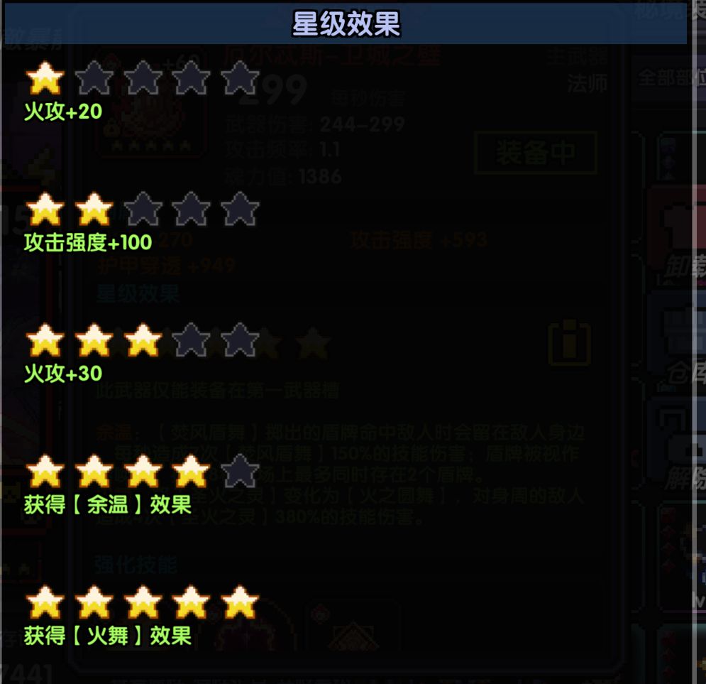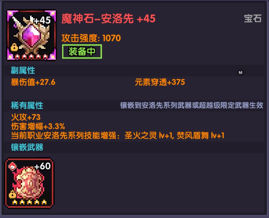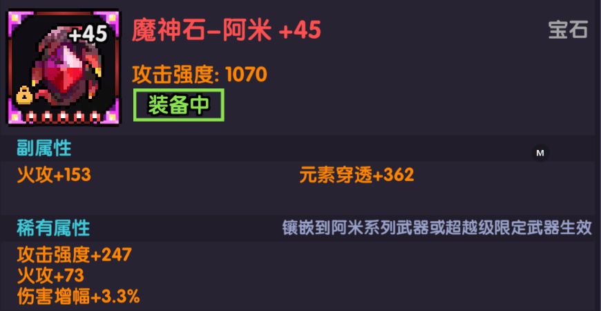 宝石选择:当技能总等级未到达80级(外装+2)时,毕业宝石的稀有属性为 火攻 伤害增幅 技能等级+1此时的稀有属性优先级为 伤害增幅>技能等级>火攻>攻击强度>其他词条