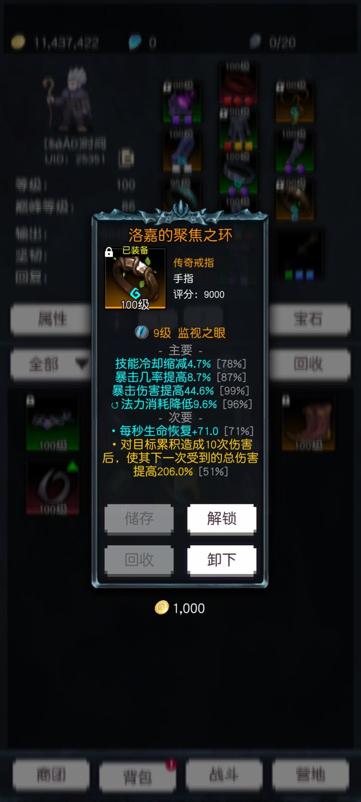 ok啊,今儿又刷到了戒指(词条太拉夸了,感觉少了20%左右的伤害也就是词条达到85%左右估计能7-8b秒伤。)