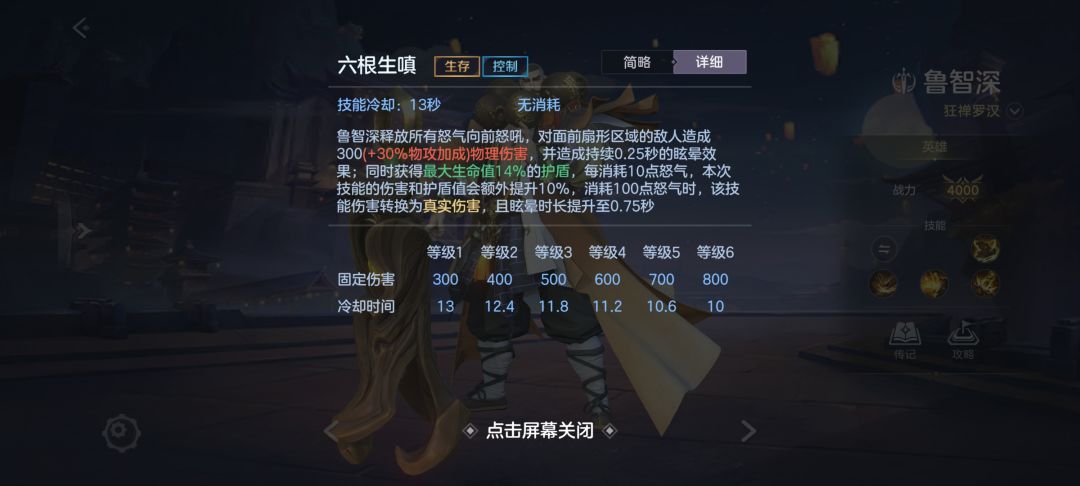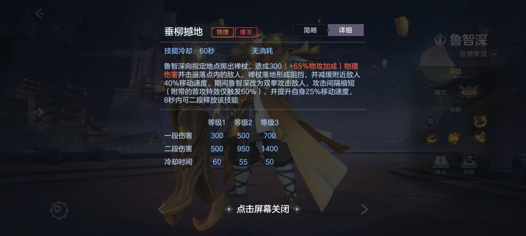刚入手鲁智深的时候,并没有想象中的那么强势,我当时以为他玩起来会跟雅典娜一样,一整个战斗爽就完了;相反,这玩意的体感很奇怪,续航很差,抗伤一般,关键打架还需要拉扯的,但是单看小技能觉得他应该是个近战很猛的英雄。实则不然,鲁智深出伤比想象中要慢很多。最后是大招,明明基础伤害挺高的,却打不出料想中的爆发