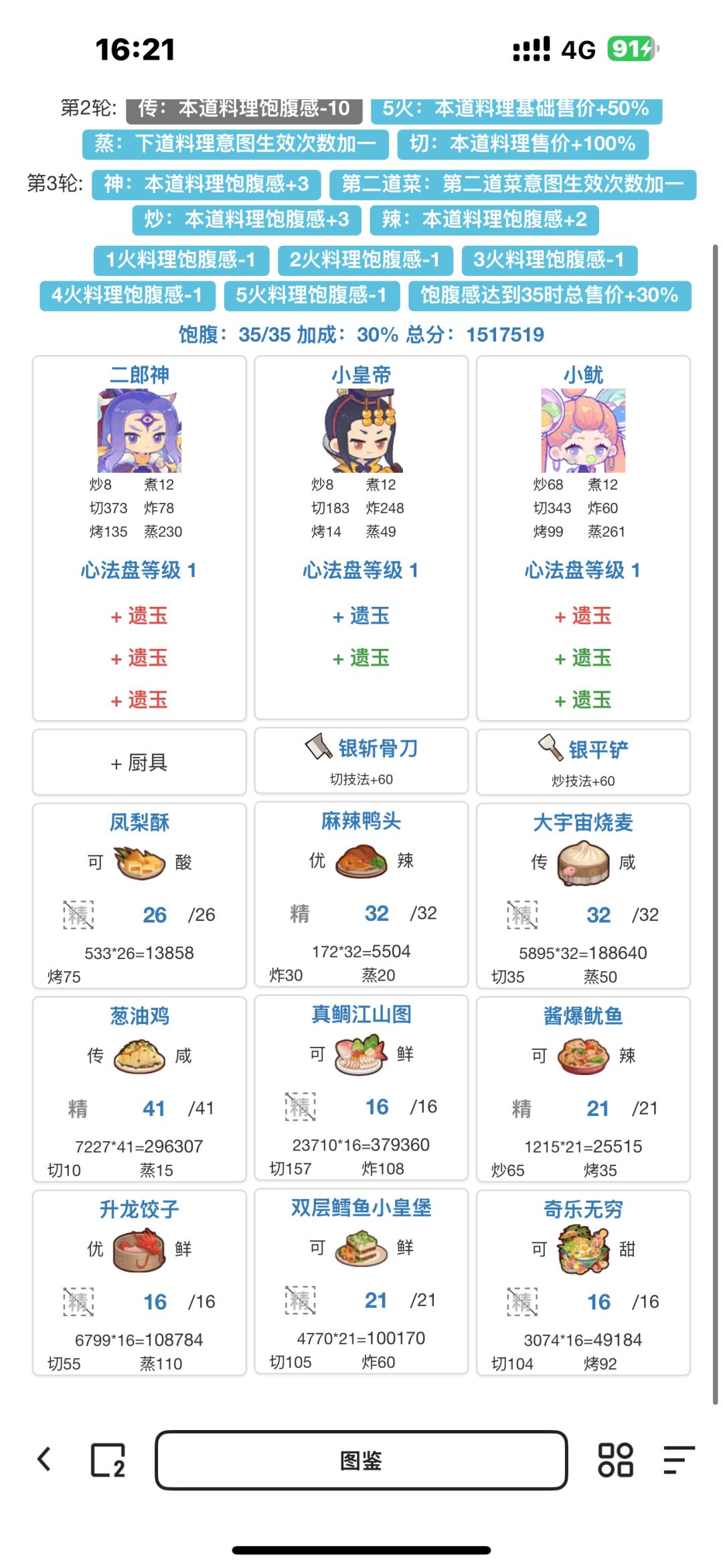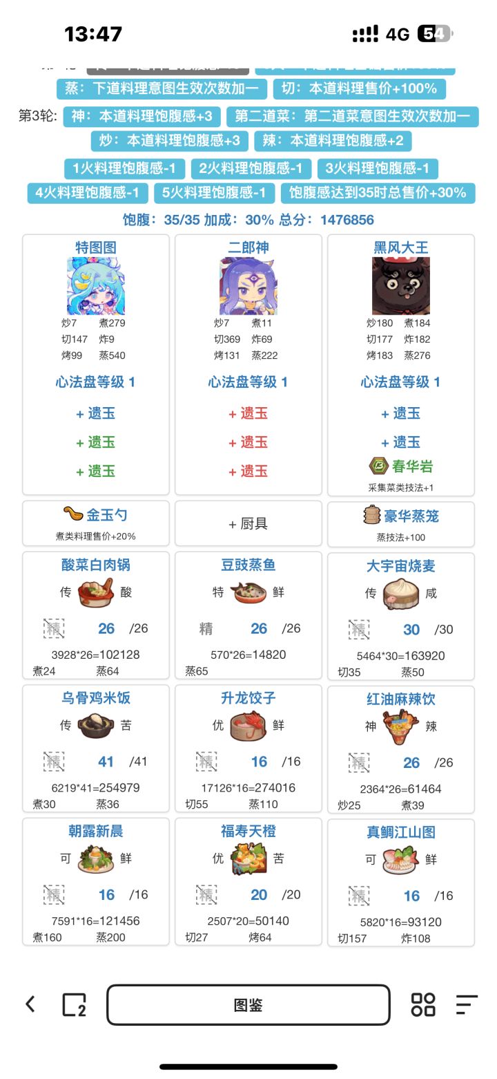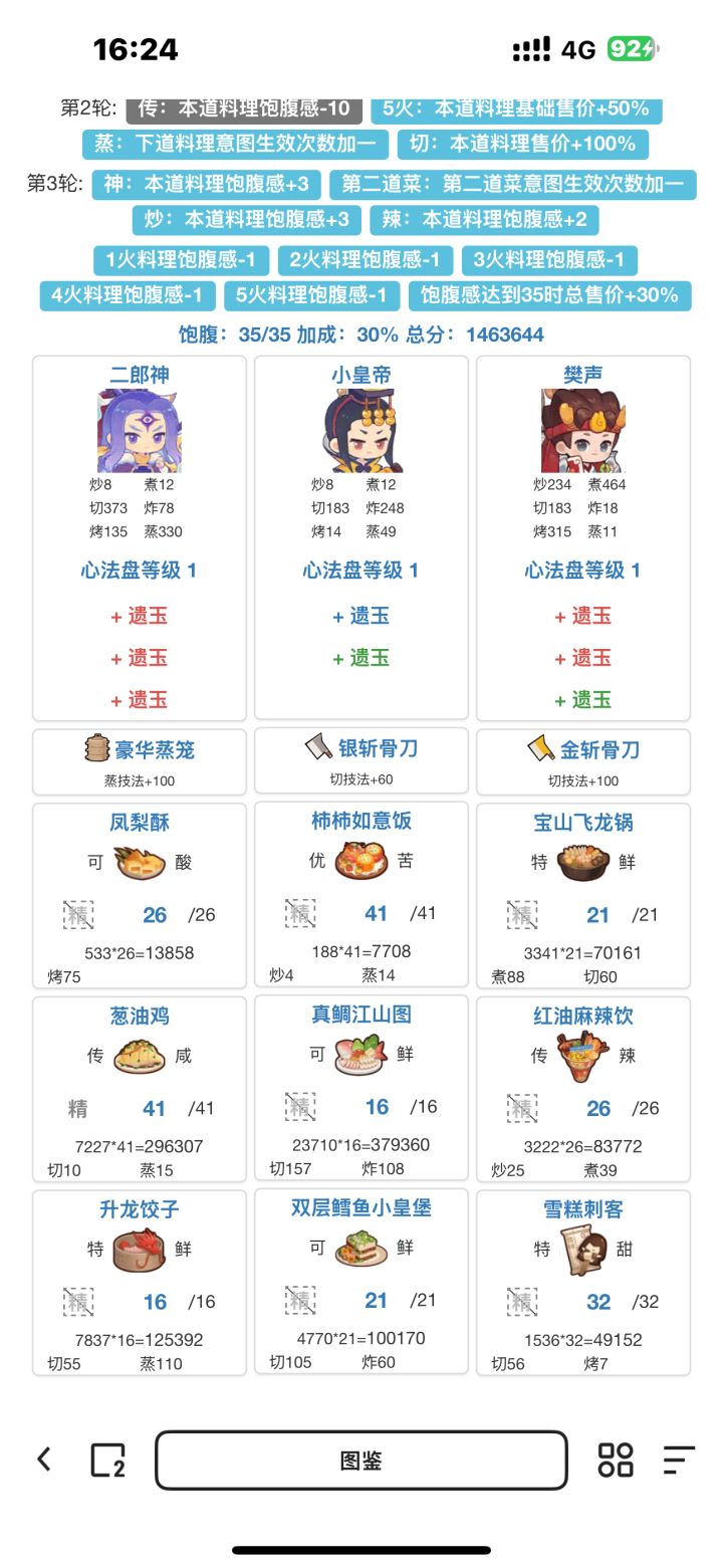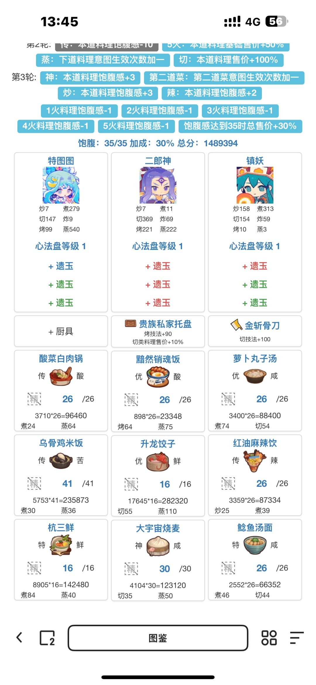 二号位,不能有做到传说级别的菜,避免减10饱食度,所以这里把二郎神的厨具换了,也可以不让他做大烧卖 留给三号位厨师做,如果三号位能做到神或者传级别的话
