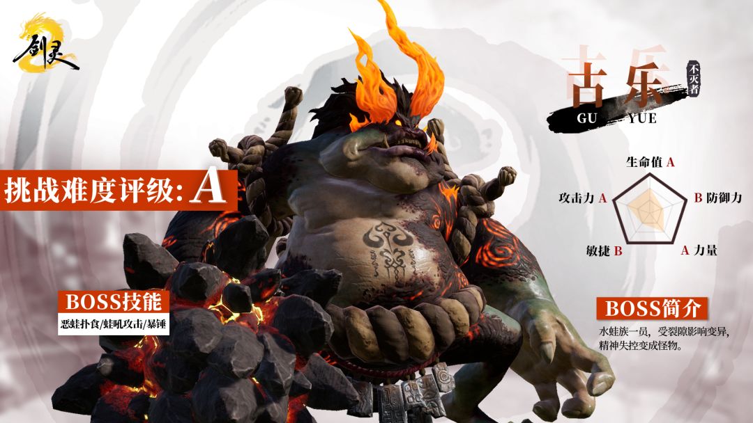 古乐,因裂隙变异,沦为精神失控的怪物。它的技能与招式,充满了残暴的毁灭力量,令人闻风丧胆。古乐有危势格,对战过程巧用QTE武功应对,成功闪避,虚弱BOSS,并打出高额伤害,即可扣除其威势格。