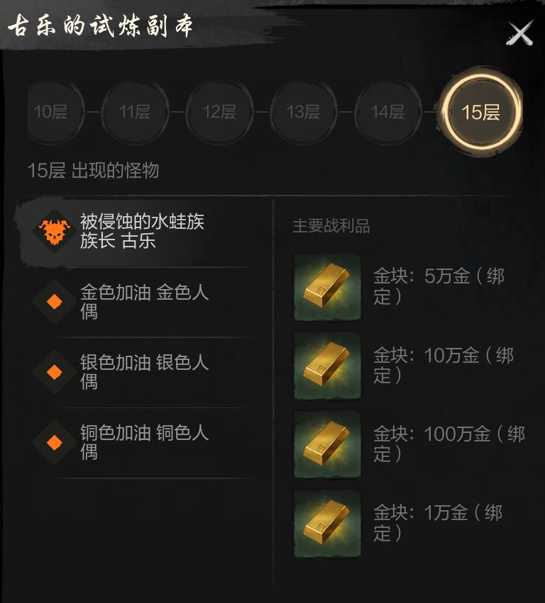 挑战古乐可以获得大量金条,若是能一路挑战至15层,百万金条,轻松到手哦。