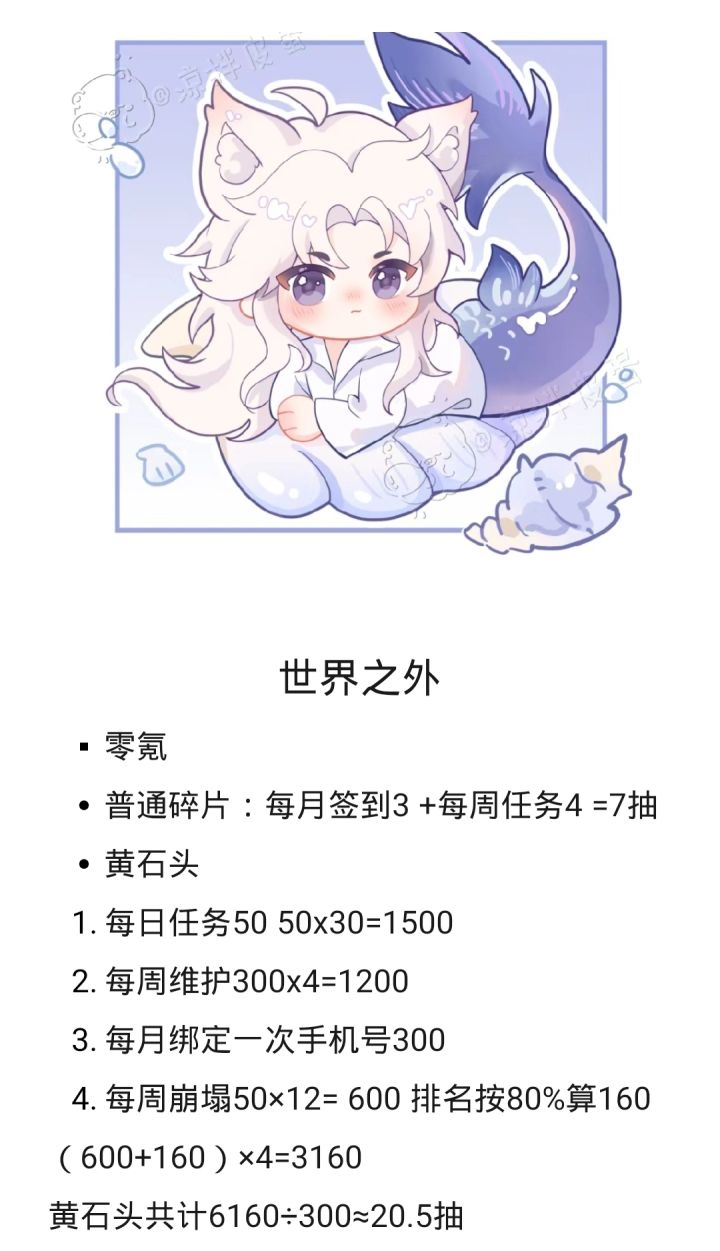 普通碎片一个月每周签到加每月签到有7抽,再然后就是限定卡池要用黄石头,一个月可以攒下20抽 ,月卡党加月卡150×30=4500,4500÷300=15抽,月卡党就是20+15=35抽,先说不说就是这个每个月的资源问题。然后就是这个池子老是歪卡的事情,这个我感觉世界之外调爆率了,先说不说,他说限定池子爆率调高了,但是运气非的人一般刚开始60多抽就是歪常驻,然后随机100抽歪非推,再然后140强娶,这对零氪党和微课党很不友好,并且他说他调爆率了,但是我感觉这爆率根本就没有调,再然后就是除非保底,反正我是这样,不然他就不会出金,这到底什么意思啊?把爆率调一调不行吗?