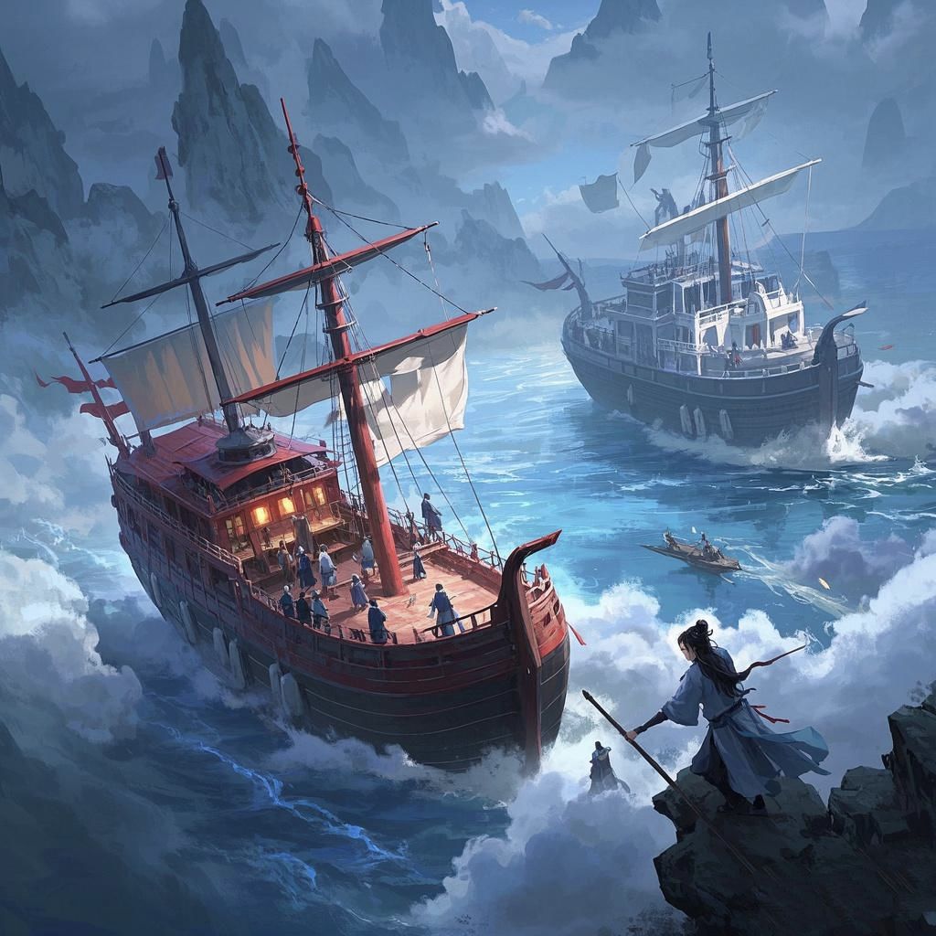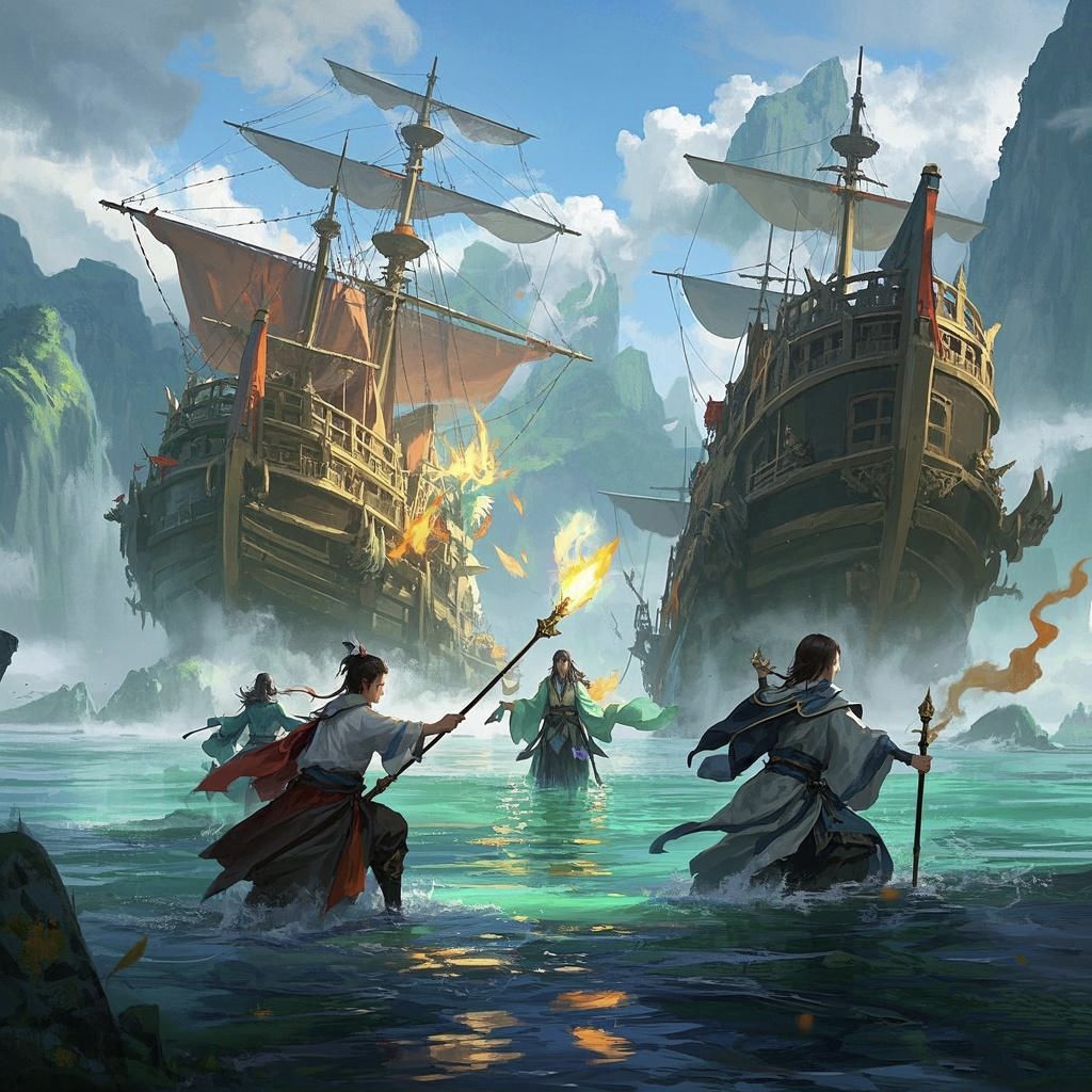 正行间,前方海域忽然传来阵阵法力波动与喊杀声。福锦上人眉头微皱,心中暗思:“这灵海如今真是乱象丛生,不知又是哪方人马在此争斗。”他当即收起飞舟,施展水遁术,身形如鱼般迅速潜入海中,巧妙地隐藏起来。凭借着紫府期强大的神识,他悄然观察着海面上两艘船的战况。