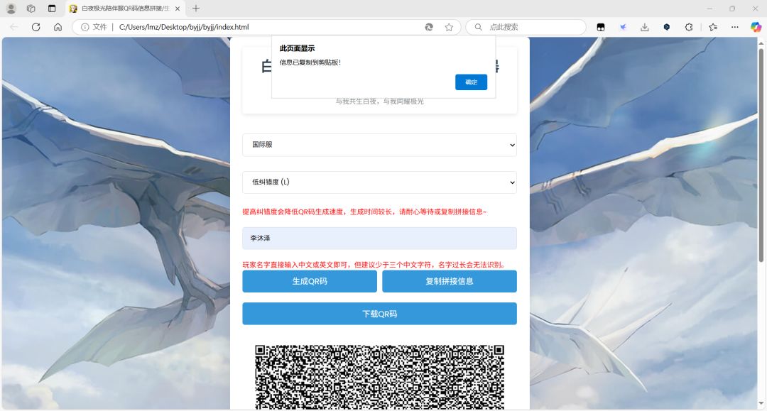 通过deepseek r1辅助,制作了一个白夜极光陪伴服QR码信息拼接生成器,国服和国际服二维码都可以做,像素1000×1000,需要的可以去我分享的网盘链接下载,里面就一个html和一个img文件夹,解压后点击html文件即可。国服的名字输入中文后,会自动转换成unicode编码,不用再去其他网站多走一趟,不过国际服信息太多,低纠错度可能导致二维码失效,可以复制拼接信息前往下面那两个推荐网站生成二维码。手机也可以下载,解压后在文件管理点击html文件跳转到浏览器打开即可使用。