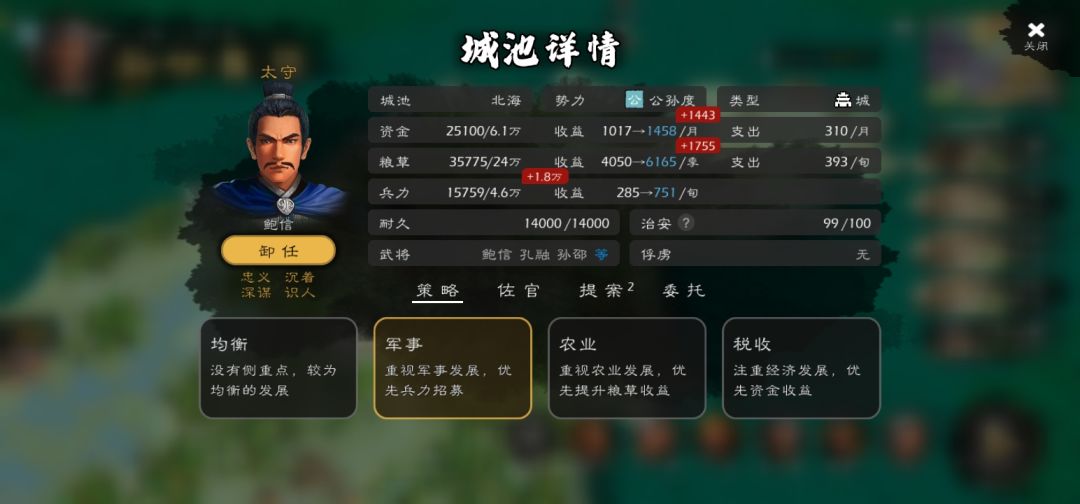 那么怎么获得加点呢,武将下面有一个经验条,当武将出征杀敌,使用战法和谋略,探索,进行内政时(在城池当官,就是太守和两个佐官)都会活的经验,再加上高难度下生产力低下,探索成了前期的过度手段,我们就需要将特殊加点路线的武将(战将,太守,运输员)手动加点并派他们去探索,时不时可以拉出去互刷计策的等级(战法使用后也会加经验升级),而这时候我们就需要升级图三的精舍,满级最好,我建议在搞出五兵营25%增幅后立马搞(征兵是根本,所有档开局基本都要先开五兵营),这样我们又有多余行动力探索升级获取物资,又可以保证官僚发展,,而前期也有个小技巧提升物资获取量,城池先设置均衡,将治安提升到100%(治安影响征兵量),然后设置成军事侧重,然后在每个月下旬改为税收侧重,在每一季(每三个月一季,就比如三月份下旬结束后就会收粮)改为粮草侧重,你就能比默认均衡获得更多资源,只不过比较麻烦前期可以用。(太守建议统高武将担任,统影响募兵速度,而钱粮在官僚升起来之后太守不占大头,太守只在城池基础量上增幅,而不是伐木场+城池基础量上再增幅,所以官僚的产出和电脑城池的缴获足够下一次出征)