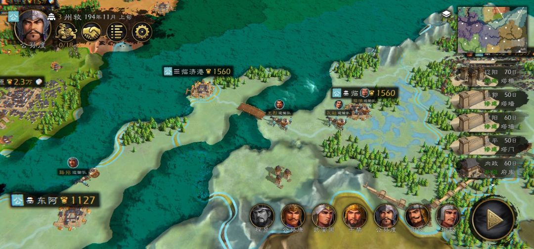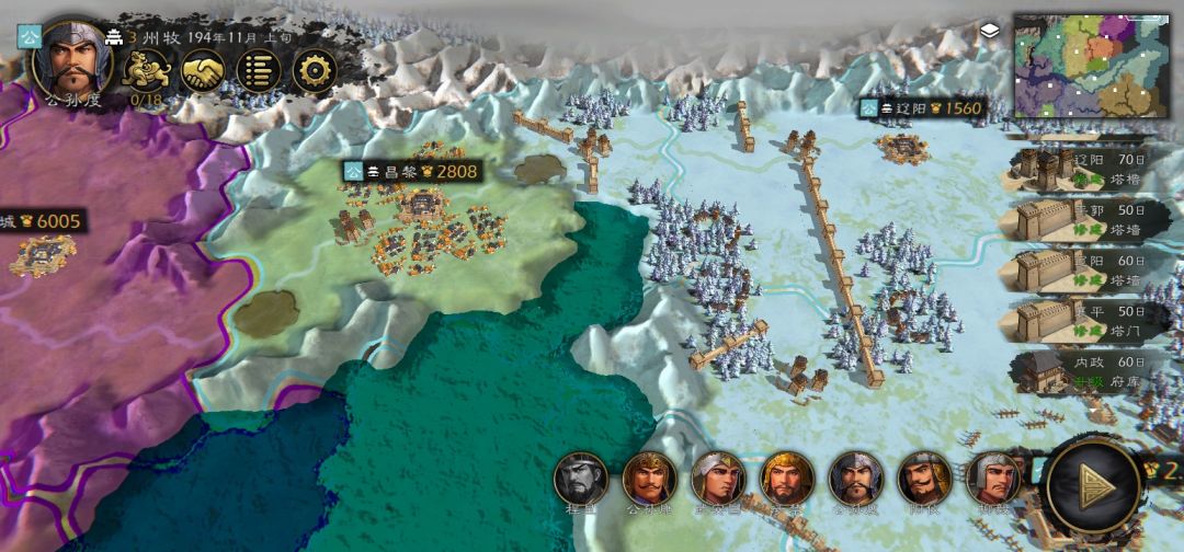 而打下城池就需要工事辅助防御,一般工事建造完电脑不会来打你,像我图五的辽东,昌黎门口的陷阱安放过后就再也没打过我,而后面的防线是我的例子,第一道防线两个墙夹一个箭塔呈凹字,可以的话门口摆陷阱,这样箭塔接敌面积只有一格,而一般敌人打掉的耐久还没有第二回合回复的多,所以基本上破不掉这个防御,箭塔可以射击前面四个敌人,而弓箭手或者远程器械电脑一般不会出动,首先名将基本都有自带特种兵,大部分是步和骑,电脑必定带特种兵,所以只能站着挨打,就算弓兵远程器械或者先登死士来了也不怕,箭塔后面一圈配上弓箭手,再后面一圈配上投石机,吕布来了也得折戟沉沙,后面两个图就是我的实际应用。