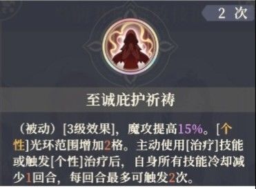 使自身范围3格内所有友军,受到治疗效果提高10/20/20/30/30%,若友军被攻击后处于[受伤]或[濒死]状态时,消耗自身1点能量,治疗该友军,治疗量为魔攻值的40/40/40/40/50%,每回合最多发动2/3/∞/∞/∞。