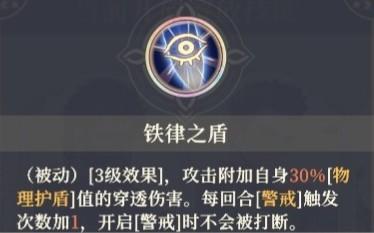 开启一阶需要20个对应材料(虔爱之徽),效果为:攻击附加自身10%物理护盾]值的穿透伤害。每回合[警戒]触发次数加1。