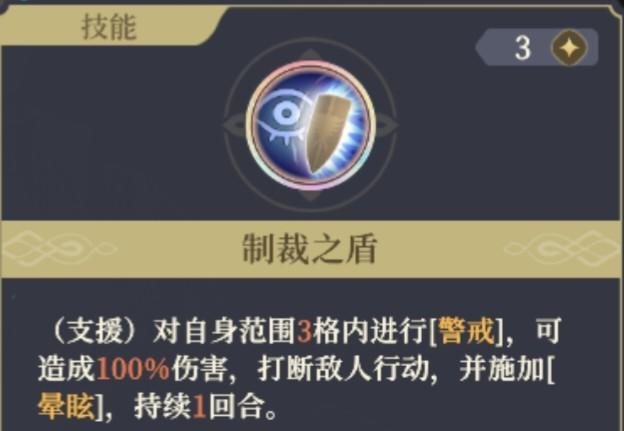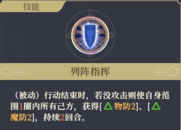 拥有[格挡]。行动结束时,对目标方向横排3格进行[警戒],可造成60/70/80/90/100%物理伤害。