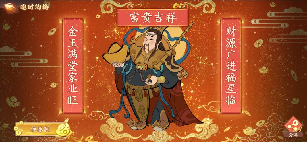 【活动说明】活动期间,书灵大人登录并完成春联分享任务,即可免费领取新角色「财神」!