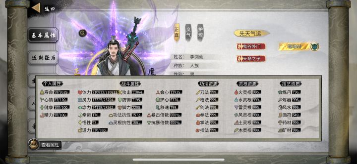 先看图片,我也是一个新手,玩的水剑,最终的通关属性我看了下比别人差很多,但对于水剑,这个属性足够通关了。说这个,就是想告诉你们,不必太过追求完美,不然太肝了,能通关就行。废话不多说