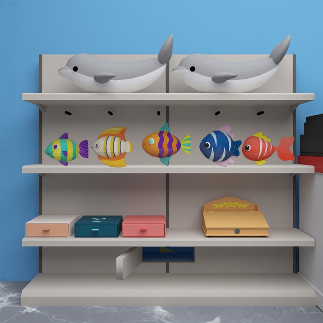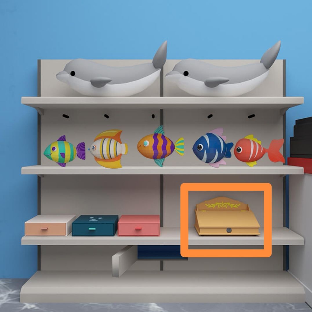 7. 把鱼倒入图1的洞中,观察它们脖子上挂的东西的颜色,重新排列柜子上的鱼,拿到另一个黄色三角木块。