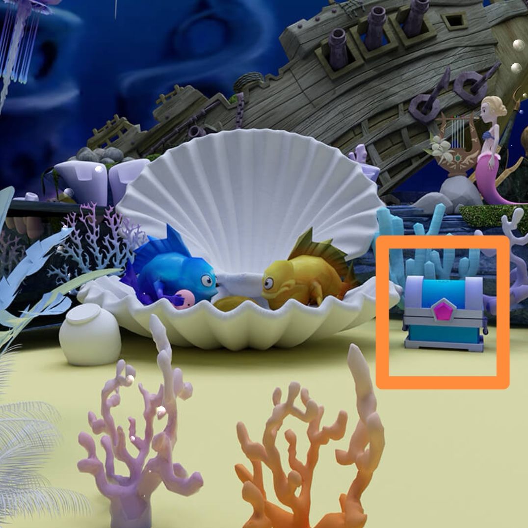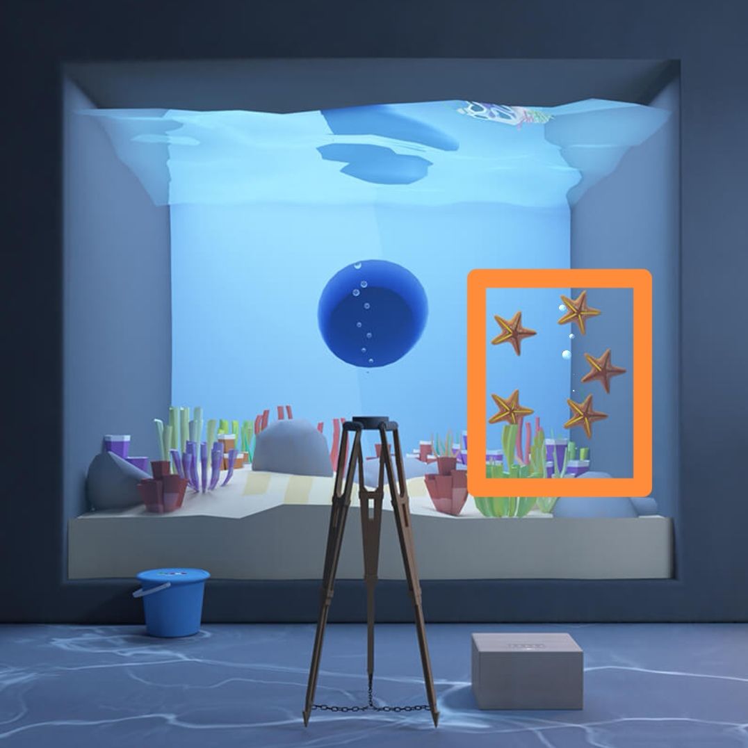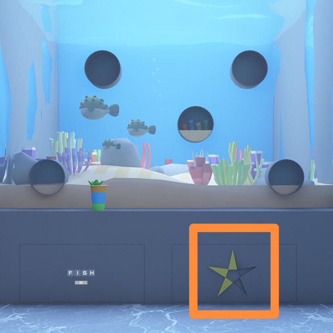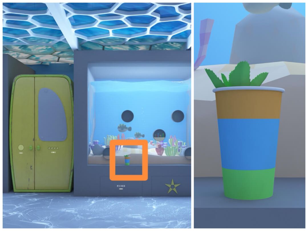 11. 查看灯笼鱼闪烁的灯光的颜色顺序,结合水草的高低位置,打开图2,拿到一个蓝色的球。