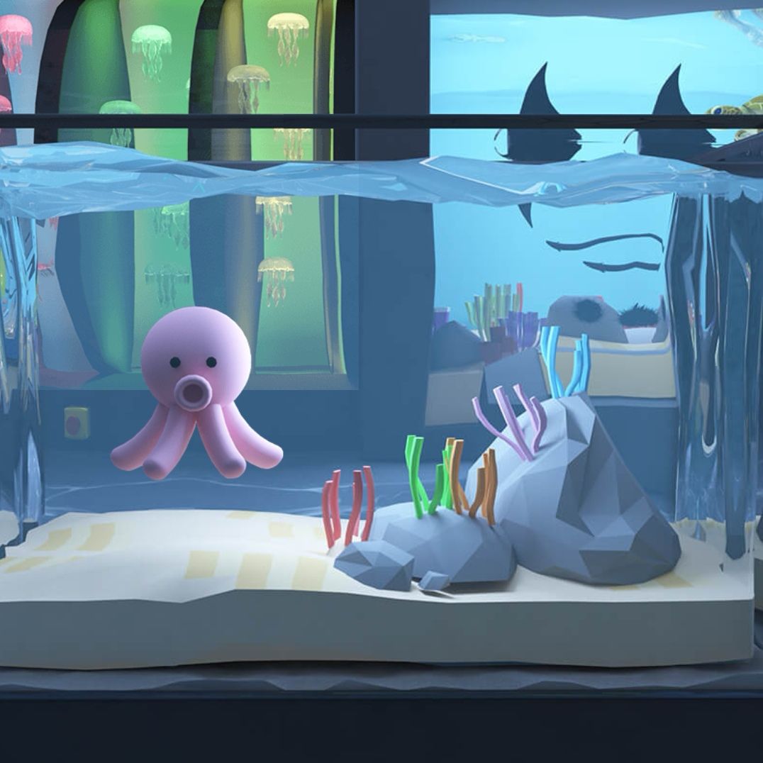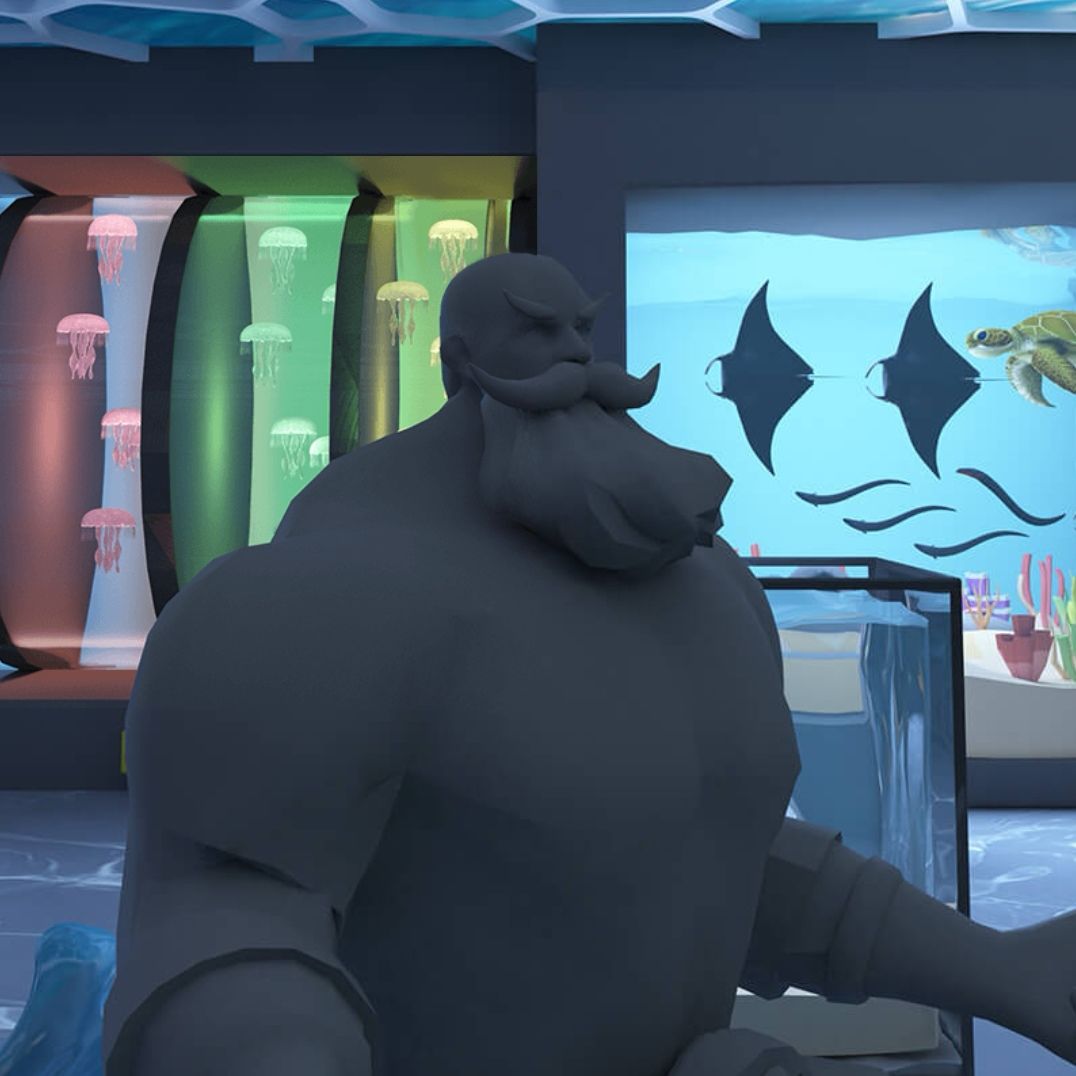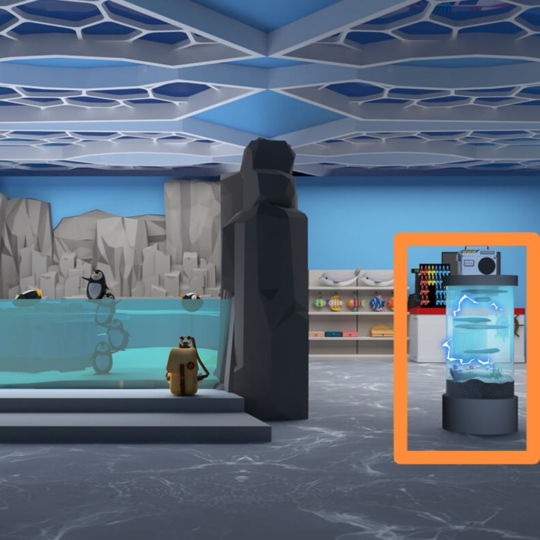 2. 使用拖把把地上的污渍拖干净,记住海马出现的大小顺序,可以打开企鹅展柜前面的黄色背包,拿到一个红色按钮。