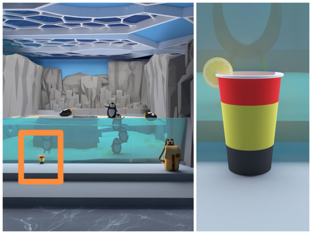 13. 根据企鹅前面的,以及黄色柜子右边的两个杯子上的颜色,可以打开地下的紫色箱子,拿到一个照相机。