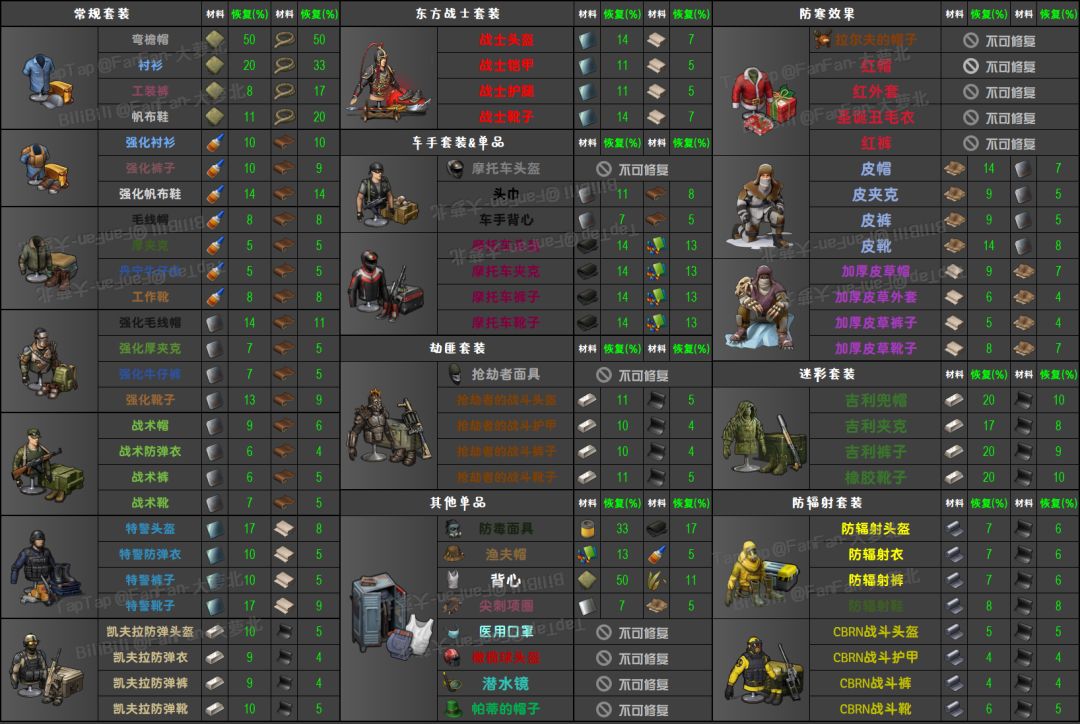 本文统计了当前能修理的武器/装备的材料需求以及每种材料可供恢复的耐久(%)