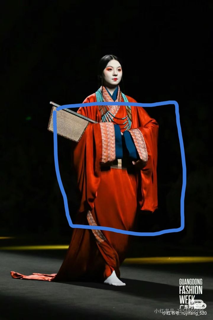 是以战国时期中的楚国服饰作为灵感来源,运用了交领宽腰带松石项链等元素,战国袍中我认为袖子是其一大特色,我想过几种融合的方式,最后选择以它的形状进行融合,以及袖口中层层叠加的布料。